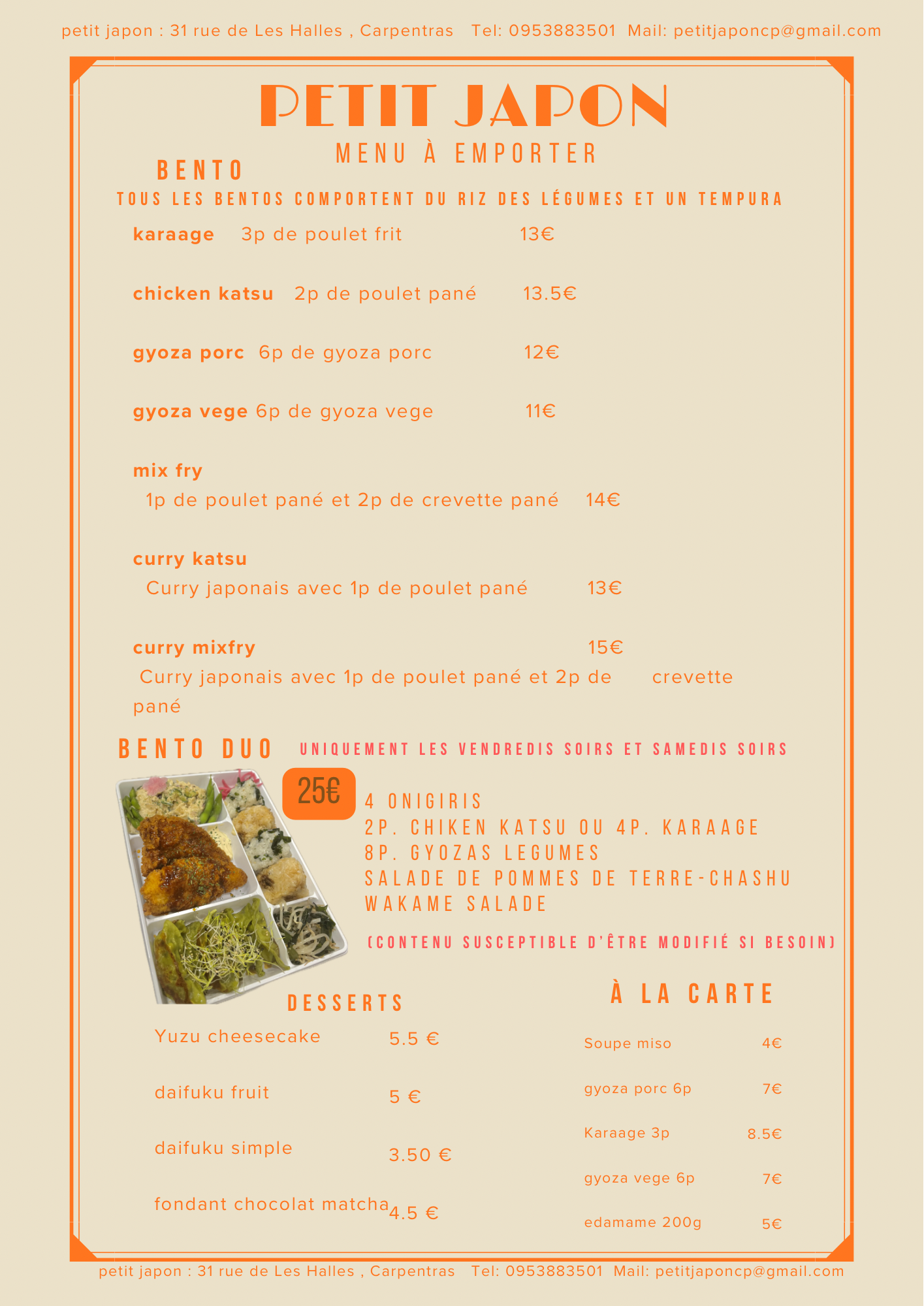 Installé à Carpentras en avril 2023, notre restaurant japonais a pour but de faire découvrir la cuisine familiale japonaise et de donner à nos clients un aperçu de cette gastronomie si riche et si développée. Tous nos produits sont faits maison et préparés avec amour !